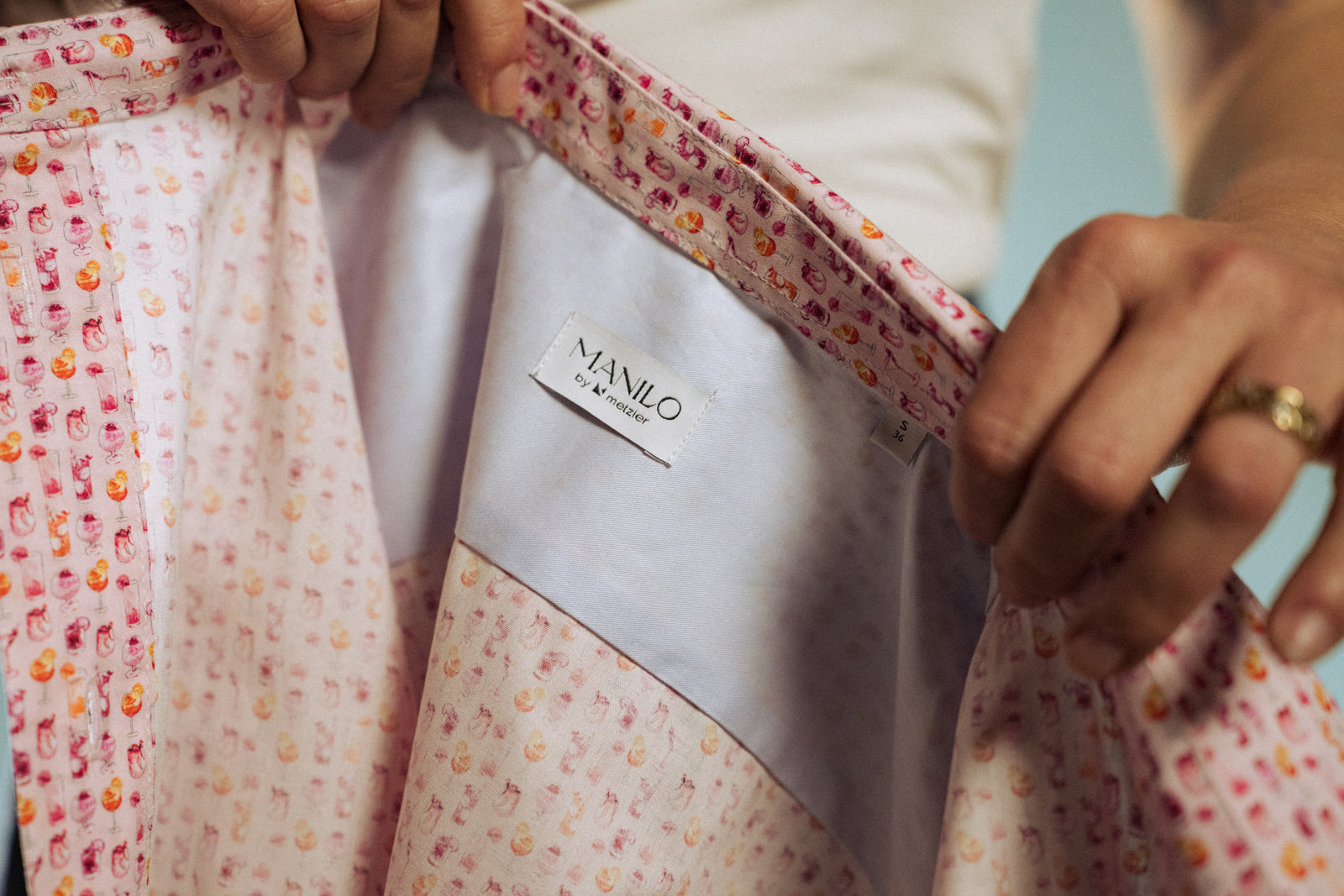 Jede Bluse und jedes Hemd mit Cocktail-Print trifft auf den passenden Drink – visuell und akustisch. Eiswürfel, fliessende Drinks, feine Details. Geräusche, die ein Gefühl auslösen.